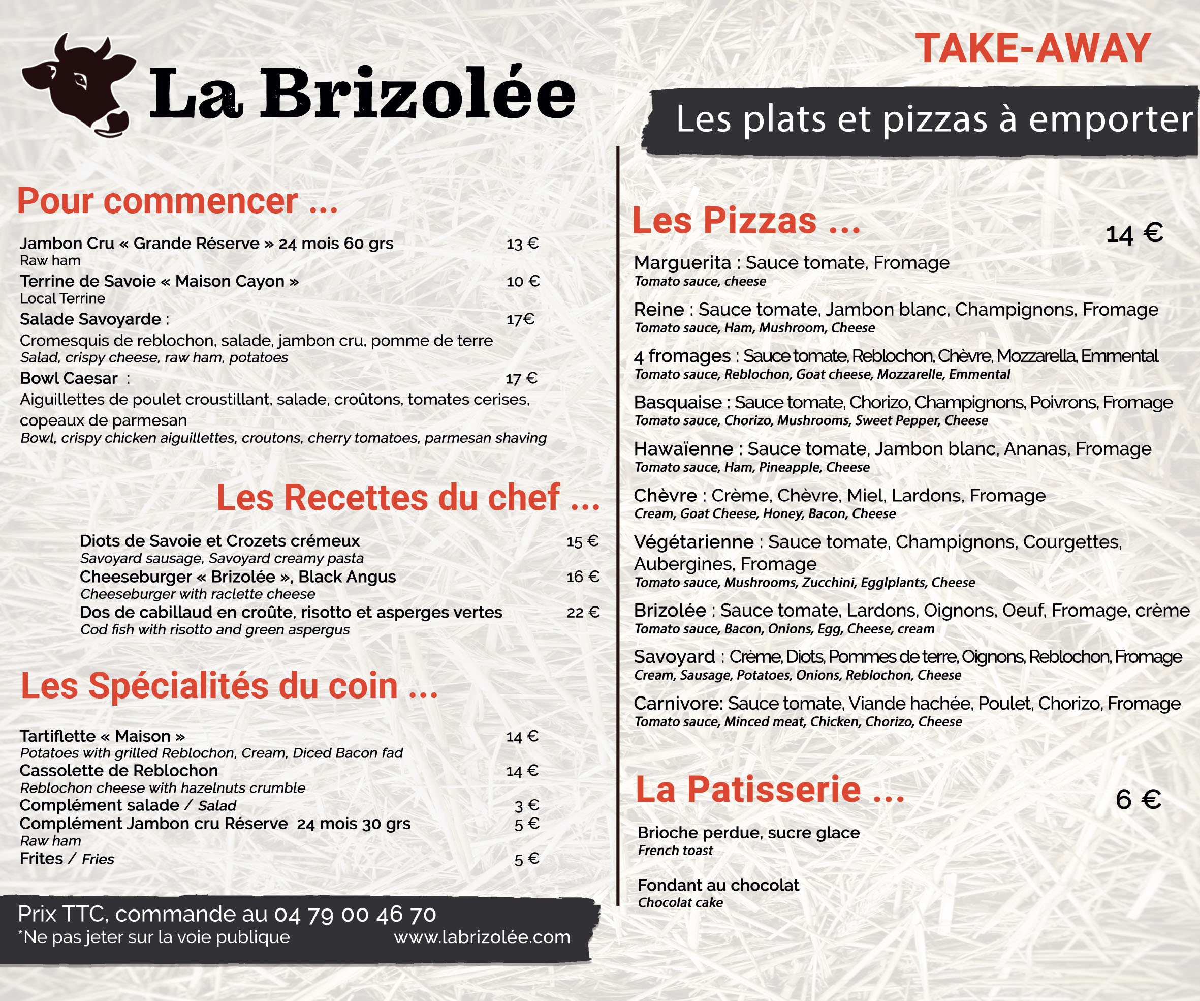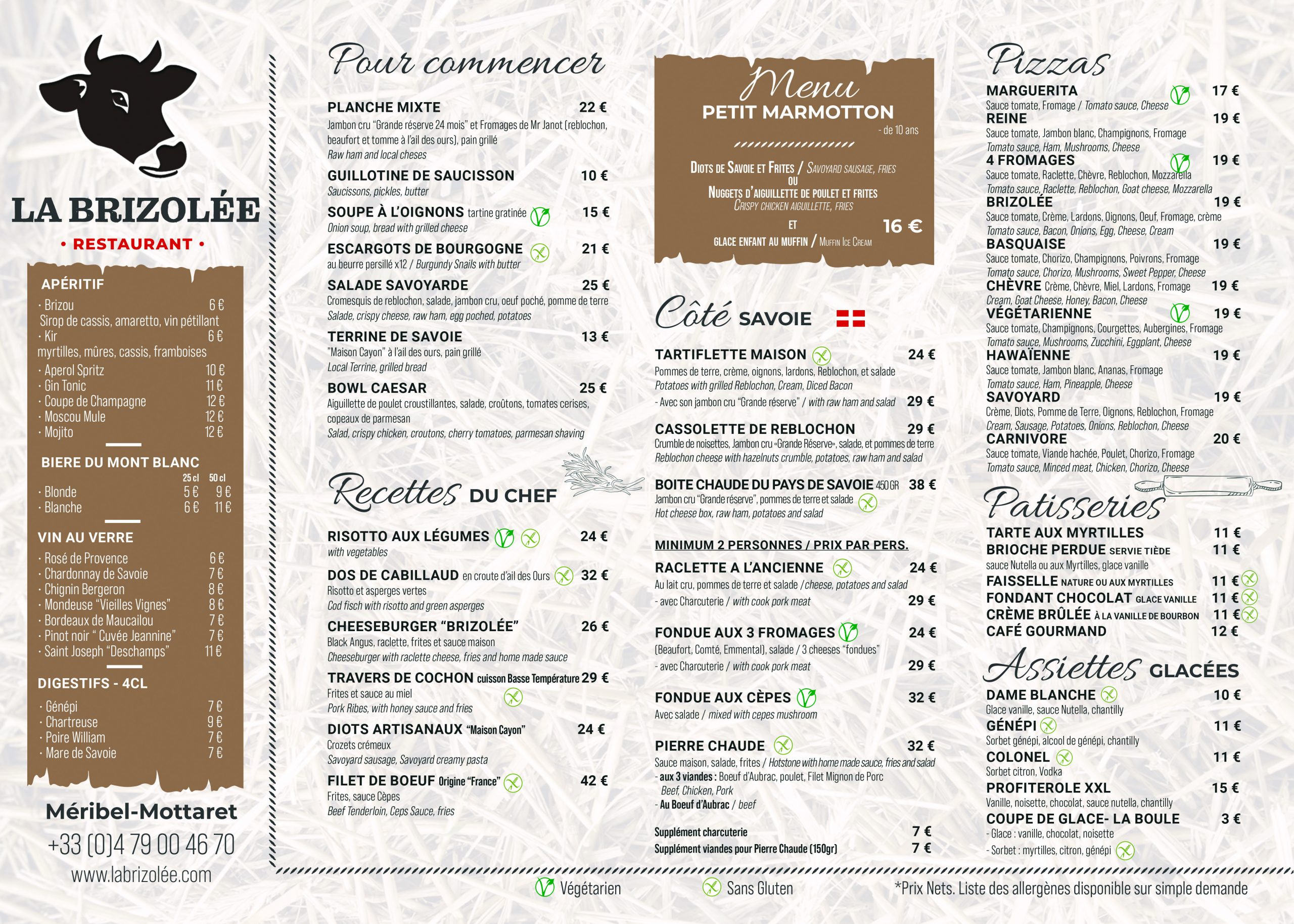 Dans un cadre typique de nos montagnes, nous vous accueillons pour vous faire passer un bon moment à table. Nos spécialités savoyardes ; raclette à l’ancienne, fondue savoyarde, pierre chaude, Mont d’or ou encore tartiflette et sa charcuterie de Savoie. Notre chef Olivier Rouffignac vous propose également une cuisine plus raffinée avec foie gras maison, filet de boeuf, côte de boeuf, brochettes gambas et st jacques, risotto maison… Des bons moments à partager en famille ou entre amis qui vous laisseront des souvenirs heureux à la Brizolée ! Service de 19h à 22h30.